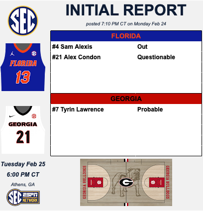 On Monday, the SEC issued the availability report for Tuesday’s game between Georgia (16-11, 4-10 SEC) and No. 3 Florida (24-3, 11-3). UGA guard Tyrin Lawrence has been upgraded to probable for the conference clash in Athens. Florida lists forward Sam Alexis as out and big man Alex Condon as questionable.
