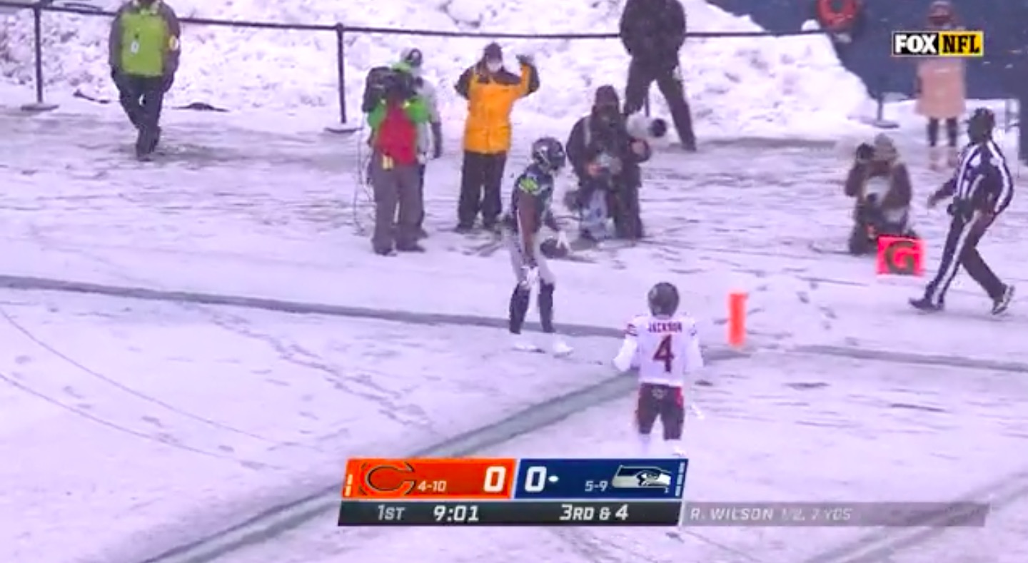 Snow problem: DK Metcalf snags long touchdown pass in snowy Seahawks-Bears game