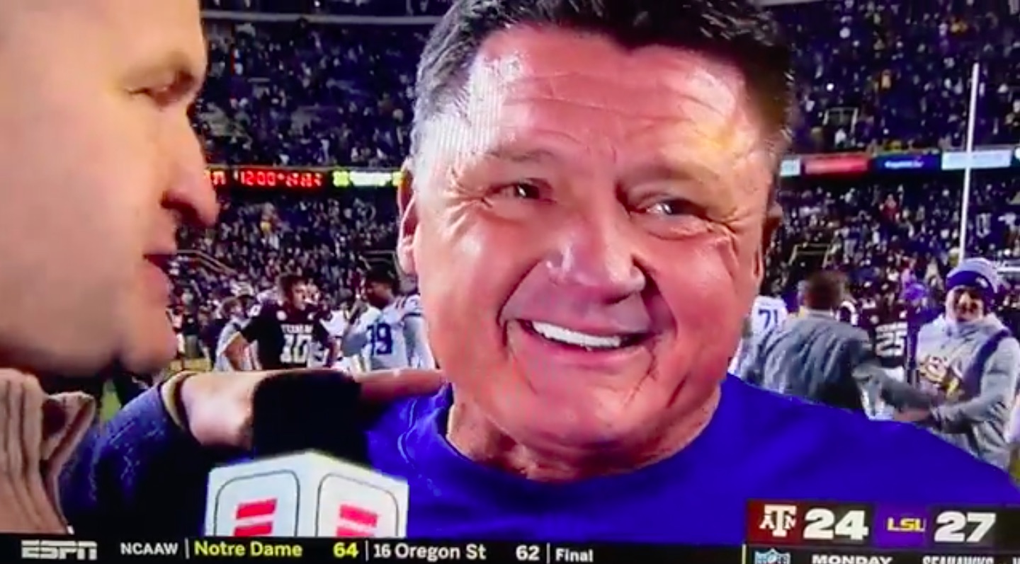 Ed Orgeron gets emotional discussing LSU’s come-from-behind win over Texas A&M