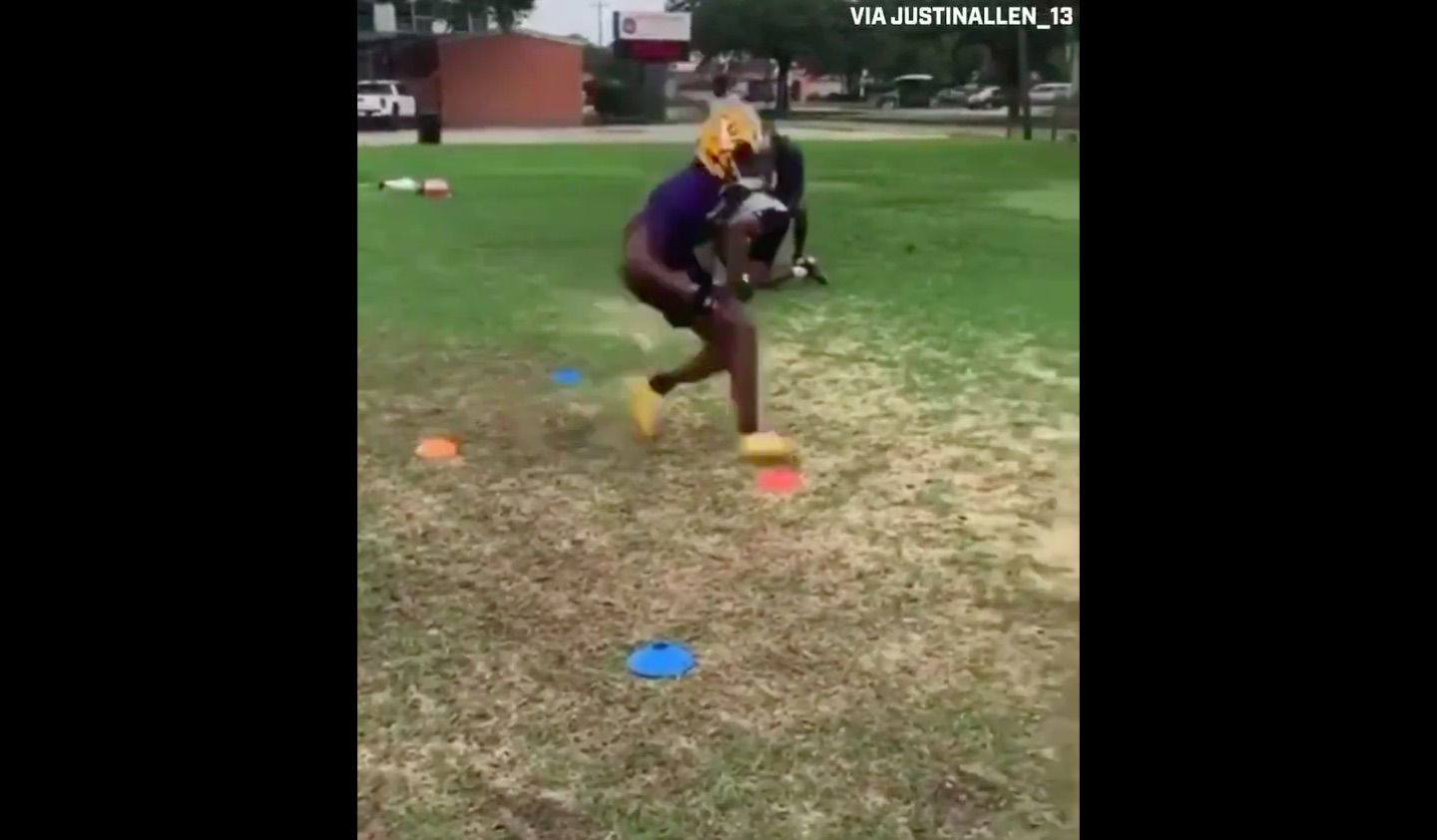 Justin Jefferson showing off footwork, quick hands during workout while wearing LSU helmet