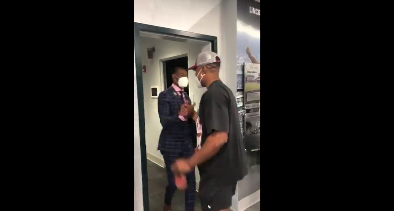 Jalen Hurts greets DeVonta Smith upon arrival to Philadelphia