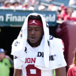 Oklahoma receiver carted off the field following awkward collision with brick wall