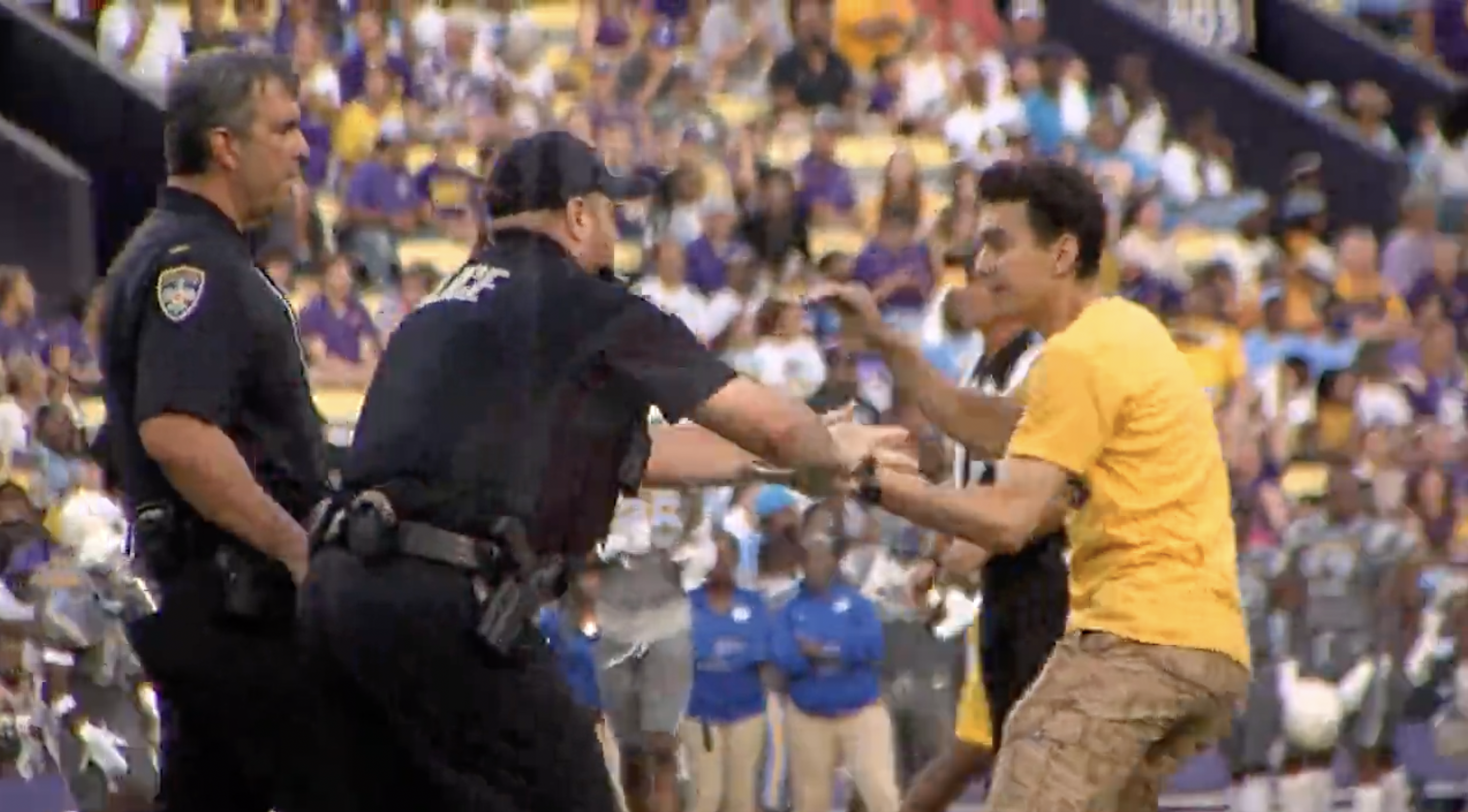 Fan casually walks on field at Tiger Stadium, fights with cops