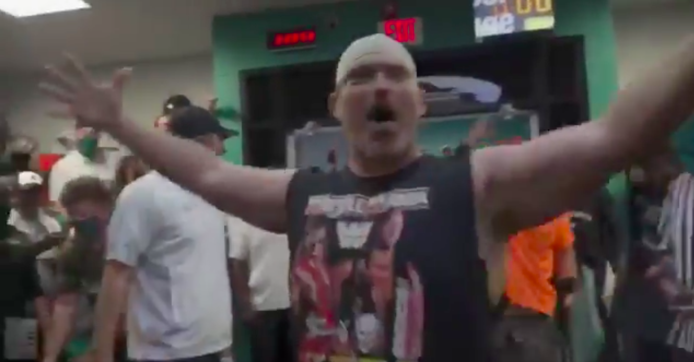 College team celebrates big win with bizarre WWE-style locker room stunt