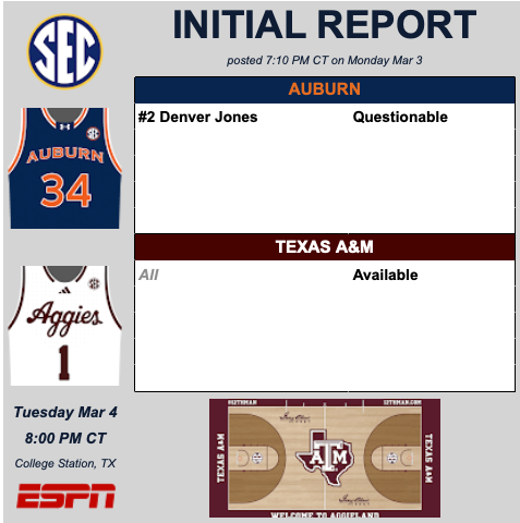 Denver Jones is currently “questionable” for No. 1 Auburn’s game against No. 22 Texas A&M on Tuesday.