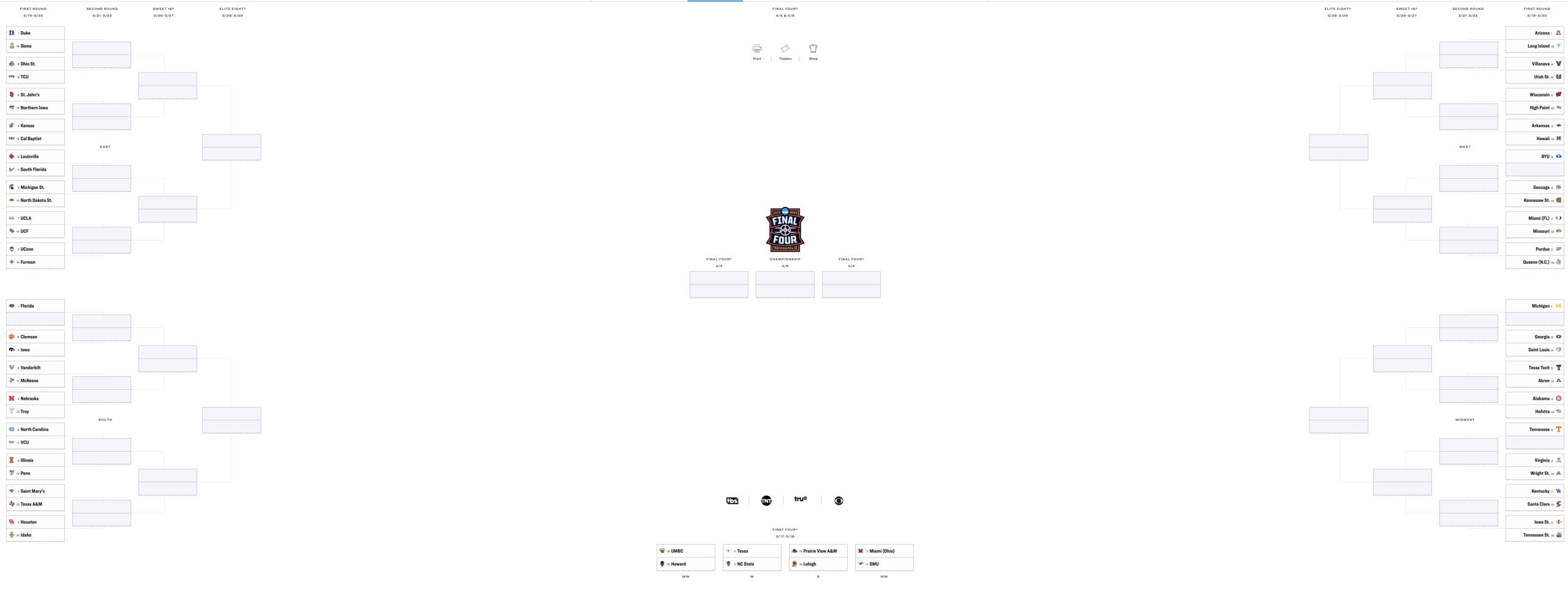 The tournament starts with First Four action on Tuesday and Wednesday. For many, the Madness truly begins with the 64-team field in action on Thursday and Friday.