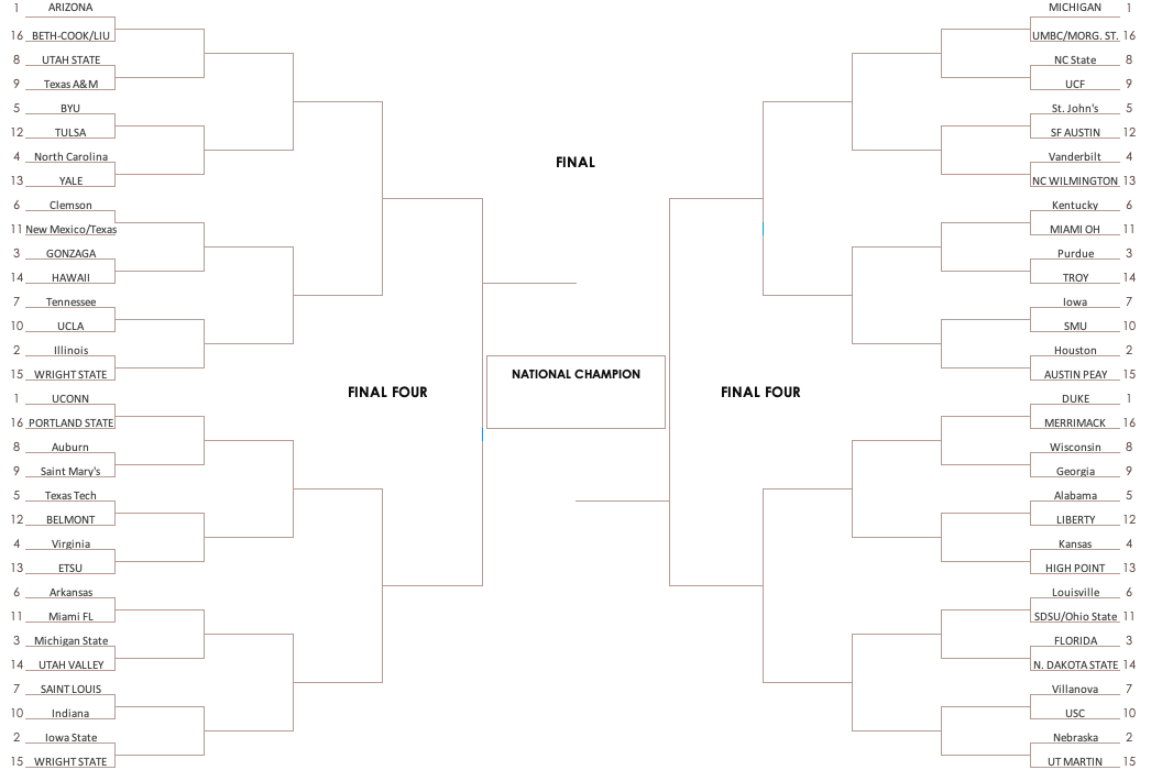 No. 1 Seeds: Arizona Wildcats (West Region), Michigan Wolverines (Midwest Region), Duke Blue Devils (South Region), UConn Huskies (East Region)