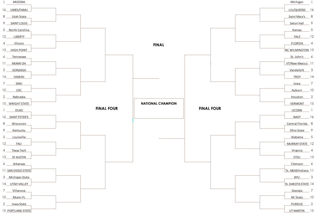 No. 1 Seeds: Arizona Wildcats (West Region), Michigan Wolverines (Midwest Region), UConn Huskies (East Region), Duke Blue Devils (South Region)