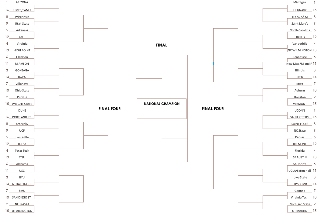 No. 1 Seeds: Arizona Wildcats (West Region), Michigan Wolverines (Midwest Region), UConn Huskies (East Region), Duke Blue Devils (South Region)