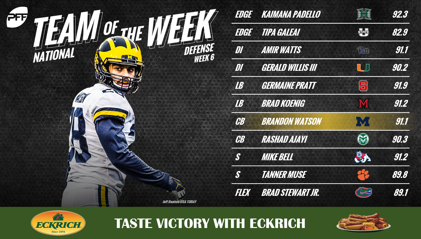 Stewart’s pick-6 on LSU QB Joe Burrow sealed the game and sealed the fate for his selection on our Team of the Week. On two targeted passes as the primary coverage defender, Stewart broke up one and returned the other 25 yards for the go-ahead touchdown that all but cemented the win.
