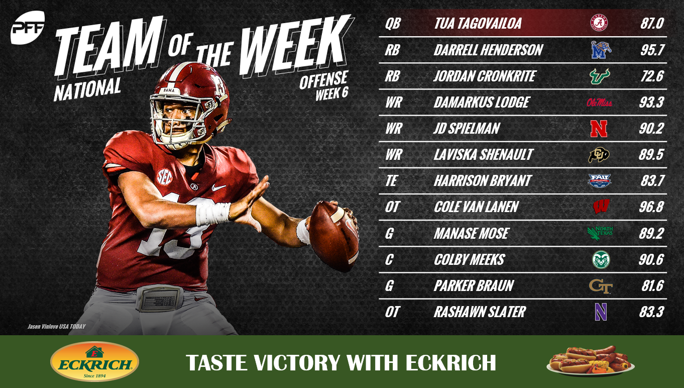 Pro Football Focus revealed its National Team of the Week for Week 6 on Sunday and three SEC players were recognized for standout performances. On offense, Alabama QB Tua Tagovailoa and Ole Miss WR Damarkus Lodge were named to the team. The lone SEC defender recognized this week is Florida DB Brad Stewart Jr.