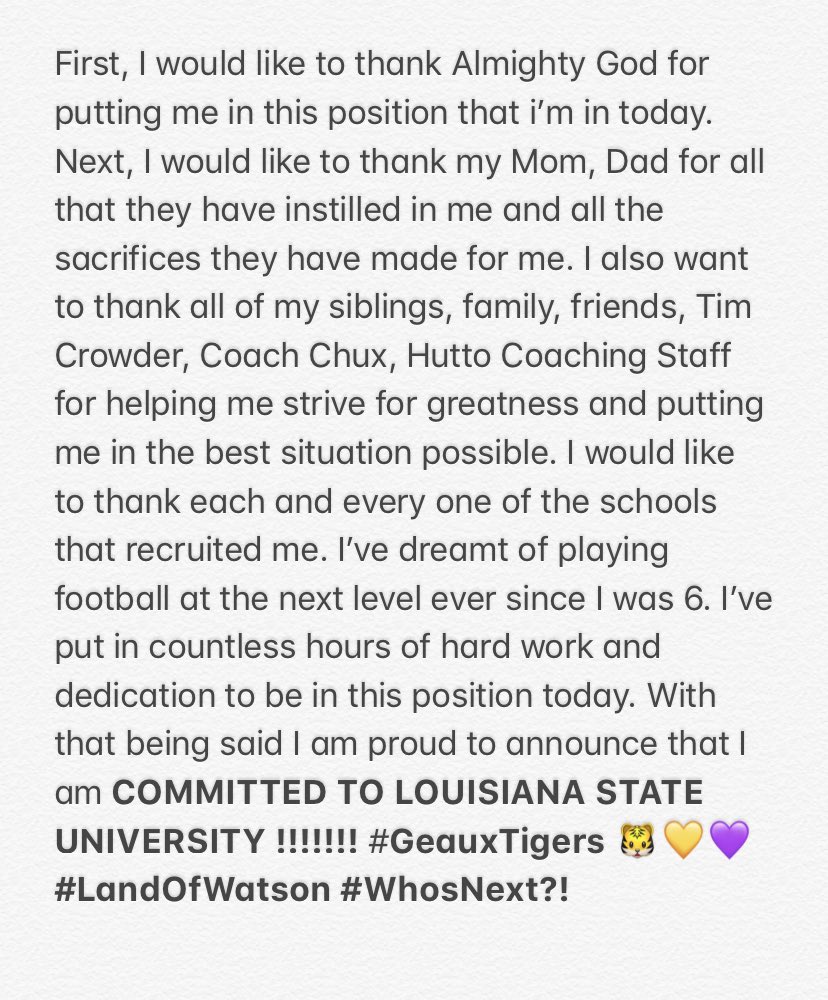 The commitment comes as Watson was taking an official visit to LSU. He visited Washington last month and Texas A&M in May. Check out Watson’s Twitter announcement and highlights below: