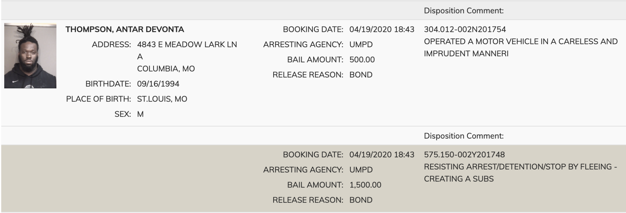 Here’s the information on Thompson’s arrest from the Boone County Sheriff’s Department: