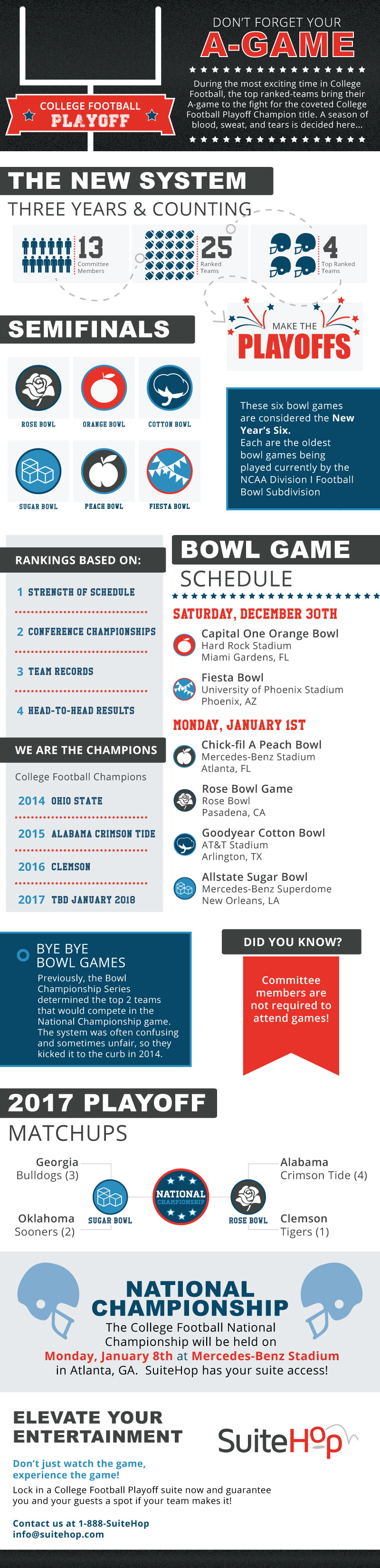 The 2017/2018 College Football Bowl games are full of powerhouse teams that will stop at nothing to finish off the season with a final victory. Leasing a suite from SuiteHop at one of the college football bowl games is an unbeatable experience that neither you, or your guests, will soon forget.