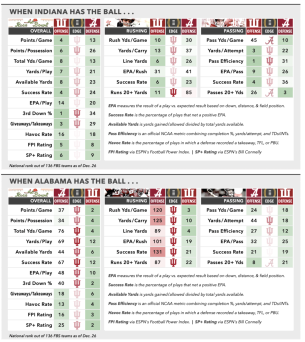 The Hoosiers come by the No. 1 seed honestly. In 2 years under coach Curt Cignetti, they boast the best winning percentage in the FBS, their only losses coming last year against the teams that went on to play in the CFP Championship Game, Ohio State and Notre Dame. This year, they reloaded in the portal — including adding Heisman winner Fernando Mendoza — and ran the table. They beat Oregon on the road and the Buckeyes for the Big Ten title, arguably the 2 most impressive victories of the season. The rest of the schedule they demolished by an average margin of 5 touchdowns per game. They have a Heisman-winning quarterback, a top-10 defense, and no glaring weakness on either side of the ball. (Take another look at the tale of the tape: Green on every line.) Even their closest call, a Nov. 8 thriller at Penn State, was less a red flag than a confirmation of their clutch bona fides with a perfect season on the line in a hostile environment.