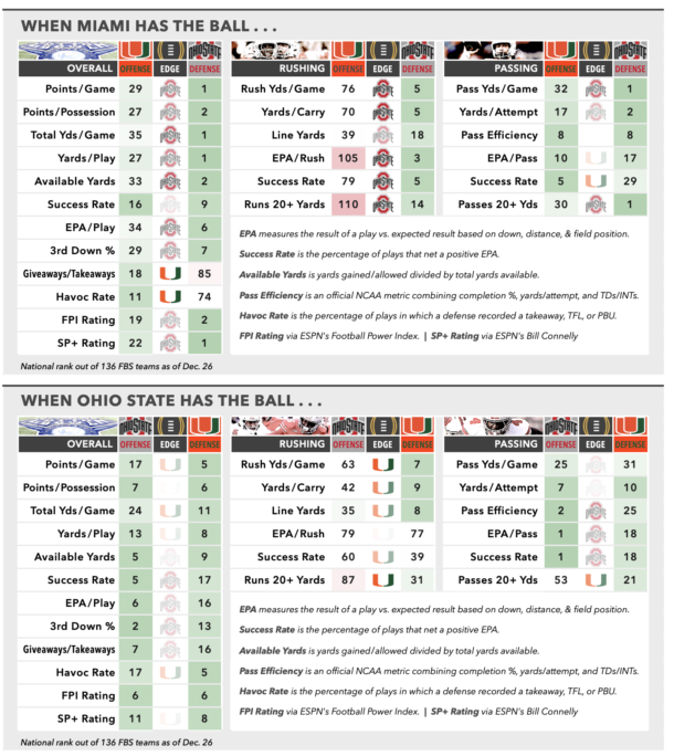 The most obvious concern coming out of the Indiana game was the offensive line. The OL was not “exposed,” or anything as dramatic as that, but IU’s defensive front seven gave Ohio State all it could handle, keeping a lid on the ground game while putting more pressure on QB Julian Sayin than any opposing pass rush this season. Keeping Sayin upright is a priority on Wednesday night opposite the most disruptive edge-rushing tandem in the college game, Rueben Bain Jr. and Akheem Mesidor, coming off a thoroughly dominant outing in Miami’s first-round win at Texas A&M. Per PFF, Bain and Mesidor combined for an astounding 19 QB pressures against the Aggies, including 5 of the Hurricanes’ 7 sacks. (Not to mention a blocked field goal by Bain.) Adding to the Buckeyes concerns up front, they’ll likely be without veteran guard Tegra Tshabola, who is listed as doubtful to play after leaving the Big Ten Championship Game in the first half. That matchup may be the only one on the tale of the tape that seems to clearly favor the ‘Canes, but as we’ve seen on both sides it’s one that can level the playing field all on its own.