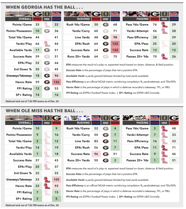 For all the upheaval in Oxford, though, Georgia also comes into the rematch looking like a different team than the first time around. Before that first meeting, it had been quite a while since the Dawgs had looked like themselves — that is, like the kind of team whose week-in, week-out dominance you could afford to take for granted. By local standards, they were on an extended run of some seriously uninspired football, marked by early deficits, narrow escapes, and a handful of sobering losses. At the time, the fade-and-rally against Ole Miss was a familiar extension of that trend. In retrospect, it looks more like a turning point. The Bulldogs were in vintage form over the next 6 weeks, throttling Mississippi State by 20 points, Texas by 25, and Alabama by 21 in an unwatchable beatdown of an SEC Championship Game that very nearly knocked Bama out of the CFP field altogether. Enough drama: For a Kirby Smart team on its game, turning a highly anticipated matchup into a one-sided slog is peak performance.