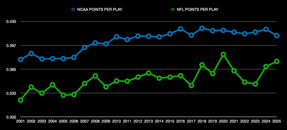 Again, we see NFL offenses rising. And here, we see college offenses maintaining. The NFL average for PPP in 2025 (0.376) was the highest non-COVID average of the century. It also marked the third straight season of year-over-year growth.