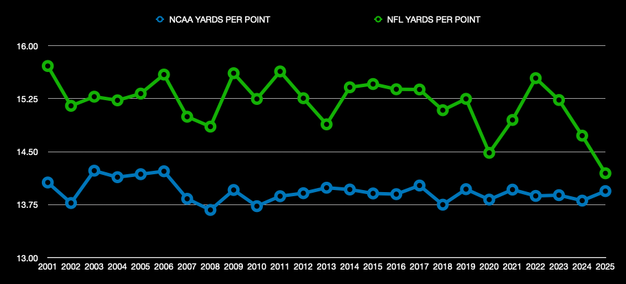 NFL offenses had their best year of the century in this regard in 2025. Offenses averaged 14.19 yards per point, down from 14.73 the year prior, which was down from 15.23 the year before that, which was down from 15.54 the year before that. From 2001-2019, the average yards-per-point mark from an NFL offense fell below 15.0 only twice. It has happened in 3 of the last 5 seasons.