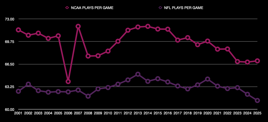 This appears to be our culprit for why scoring is trending down on a per-game basis while overall scoring efficiency isn’t showing the same kind of decline. Teams are getting fewer bites at the apple. The NFL offense averaged 61.26 plays per game in 2025, the lowest of any season this century. Teams had averaged at least 62 plays every year since 2008. Meanwhile, college offenses averaged under 67 plays per game for the third consecutive season. That happened just 1 other time in the previous 22 years.