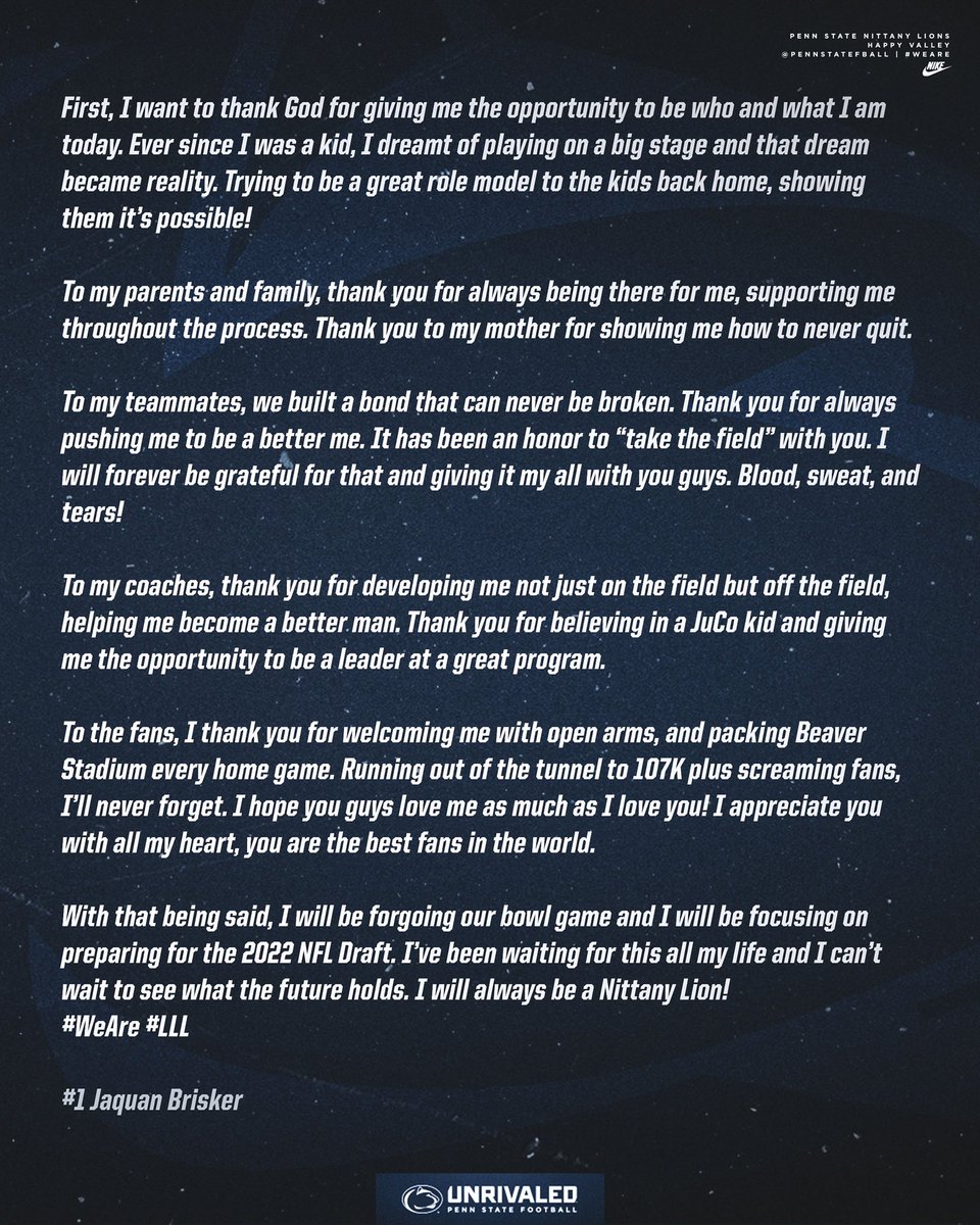 Another player was added to that list of Penn State defensive absences on Monday, as star DB Jaquan Brisker announced on Twitter he was opting out of the game: