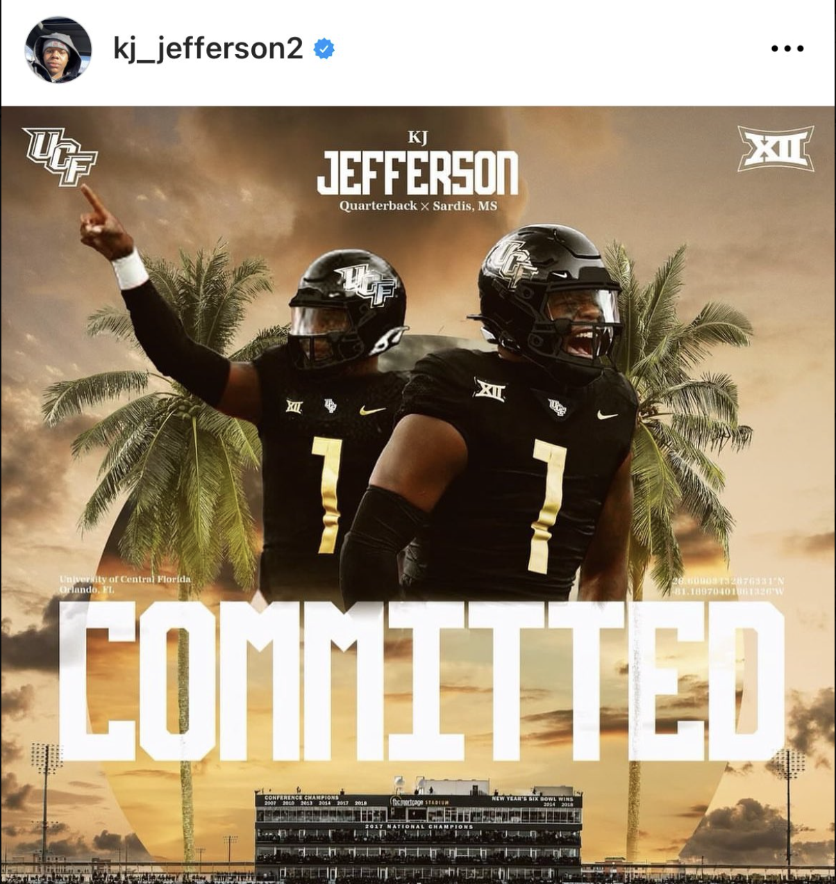 Jefferson announced on social media that he committed to UCF and coach Gus Malzahn, someone who has Arkansas ties himself. Jefferson was originally linked to UCF nearly a week ago, and now it’s official.