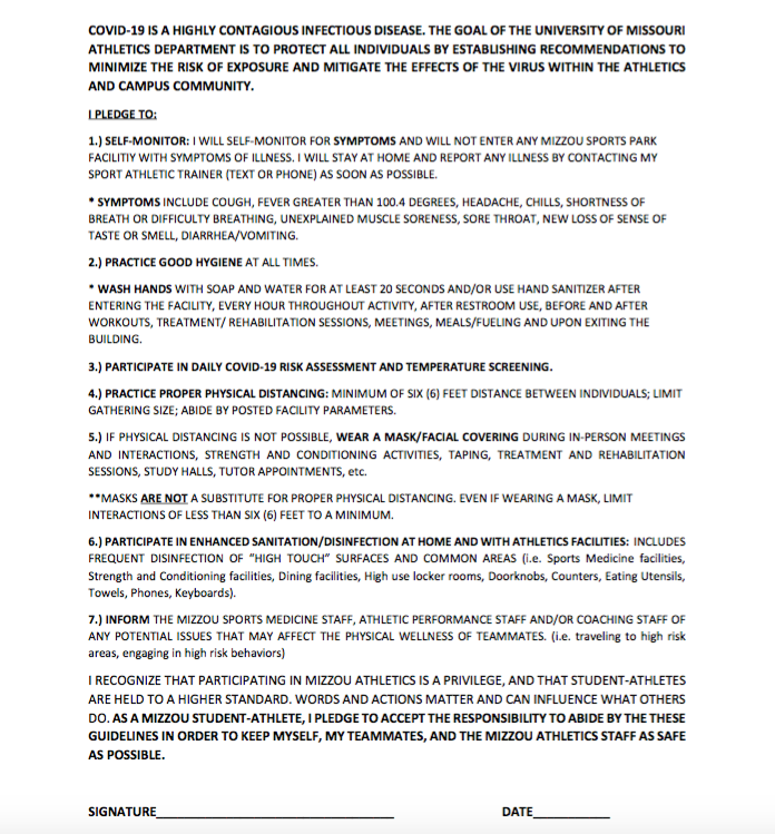 #Mizzou asked its athletes to sign a pledge saying they will take seven COVID-19 precautions, including self monitoring their symptoms, practicing good hygiene and going through daily screenings, according to the document, which was obtained through an open records request. pic.twitter.com/lBedDesfFx