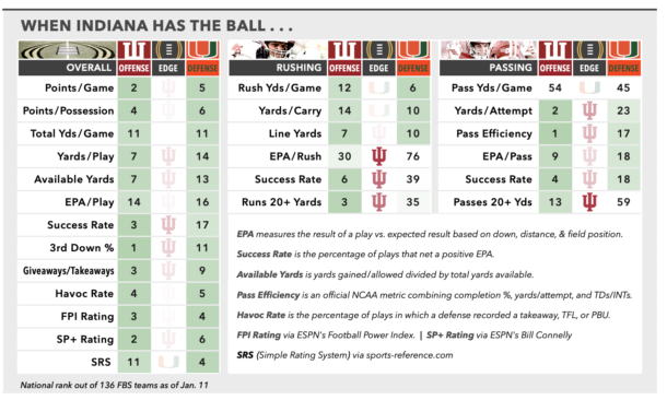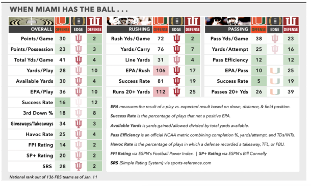 Little news on the injury front. As mentioned, Indiana’s defensive front has not missed a beat in the absence of the highly disruptive Daley. Still, 19 TFLs in street clothes is difficult to dismiss as a mere footnote. As for Miami, we’ve covered the concerns in the secondary. The question mark on offense is the status of sophomore tight end Elija Lofton, who was carted off the field in the Fiesta Bowl after taking a shot to the chest in the 2nd quarter and remains in limbo. Lofton was a frequent target in 2-tight sets alongside senior Alex Bauman, outpacing Bauman in receptions (23), yards (218) and touchdowns (3) despite playing significantly fewer snaps. The next man up against Ole Miss was little-used freshman Luka Gilbert, who hasn’t been targeted on a pass since Week 3.