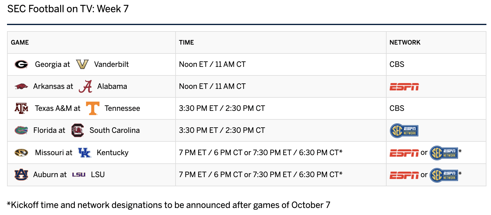 The SEC is out with its TV networks and kickoff times for games played on Oct. 14, Week 7 of the season.