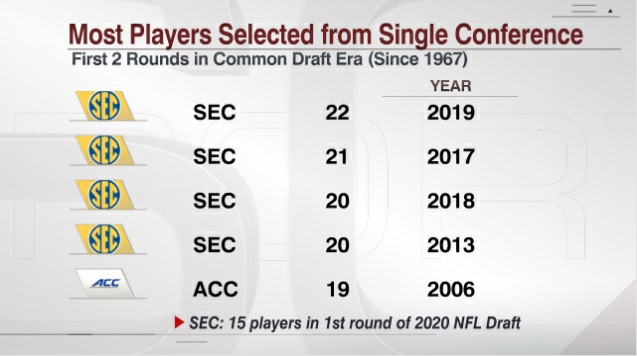 Of course, the SEC already holds the record, which it broke last season with 22 total selections during the draft’s first two rounds in the 2019 NFL Draft.