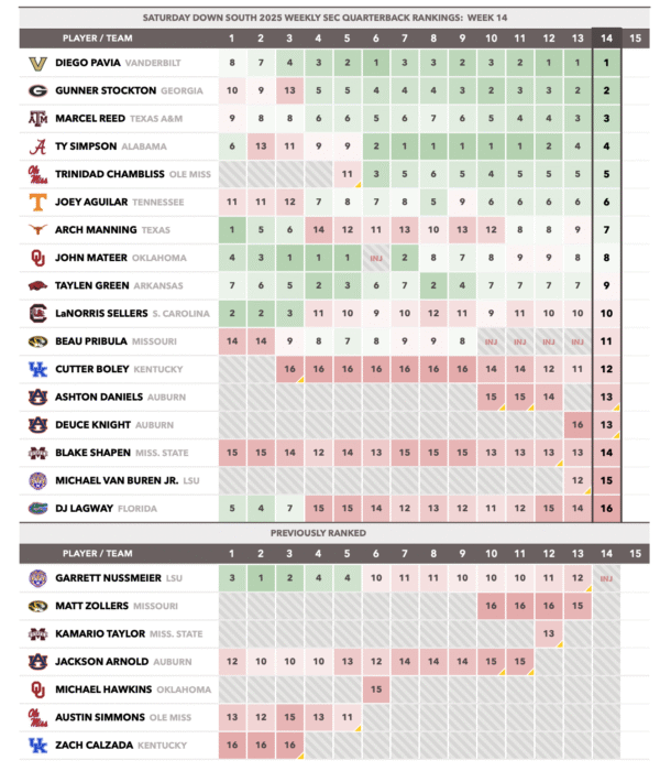 Quarterbacks: There are a lot of them! Each week throughout the season, we’ll help you keep the game’s most important position in perspective by ranking the SEC starters 1-16 according to highly scientific processes and/or pure gut-level instinct. Previously: Week 1 | Week 2 | Week 3 | Week 4 | Week 5 | Week 6 | Week 7 | Week 8 | Week 9 | Week 10 | Week 11 | Week 12 | Week 13.