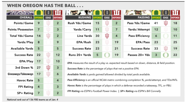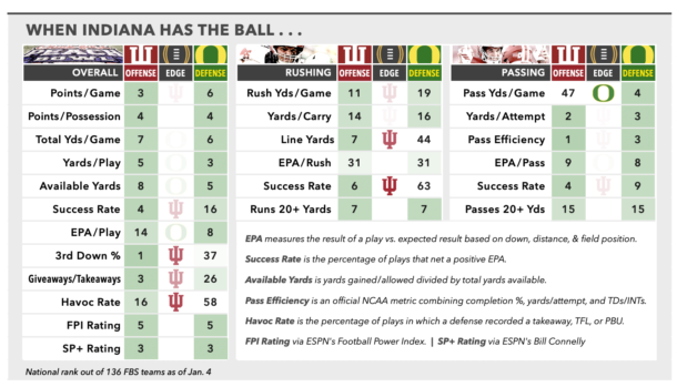On paper, the Ducks match up as well as any defense Indiana has faced other than Ohio State’s. They’re coming off a shutout win over Texas Tech in the Orange Bowl, and the tale of the tape reflects a couple of units that are virtually dead even over the course of the season, both in the conventional stats as well as in advanced metrics like SP+, FPI, and FEI. The first time these teams met, a 30-20 Indiana win in Eugene in mid-October, Oregon more than held its own, limiting the Hoosiers to season-lows for total yards (326), yards per play (4.8), and 3rd-down conversions (35.7%). Memorably, the Ducks also harassed Mendoza into his only really costly mistake all year, a pick-6 interception under duress that briefly evened the score at 20 early in the 4th quarter.