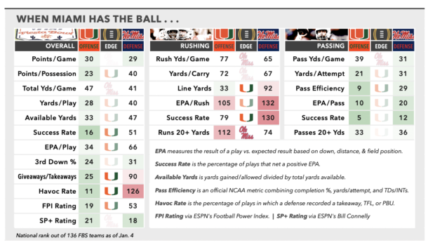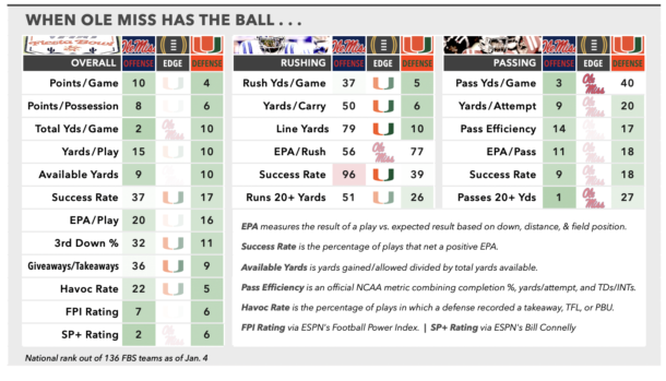 Then again, even this late stage of his career, Beck doesn’t necessarily need to be under extreme duress to be baited into mistakes. Twenty of his 28 interceptions over the past 3 seasons have come from clean pockets, including 7 of his 10 INTs this year — and 3 of the 4 picks he threw in a midseason meltdown against Louisville. He was not picked in either of Miami’s previous CFP wins over Texas A&M and Ohio State, but didn’t do much to move the needle in those games, either, throwing for a combined 241 yards on just 5.4 yards per attempt. For his part, Ole Miss coach Pete Golding has been reluctant to dial up the aggression, with the blitz rate rarely eclipsing 20% in any game. (It was exactly 20% in the Sugar Bowl; in the 2024 romp that put Beck in the crosshairs, it was just over 15%.) As long as the Rebels can hold up against the run and keep the lid on in the secondary, there’s a decent chance the rest will continue to fall into place.