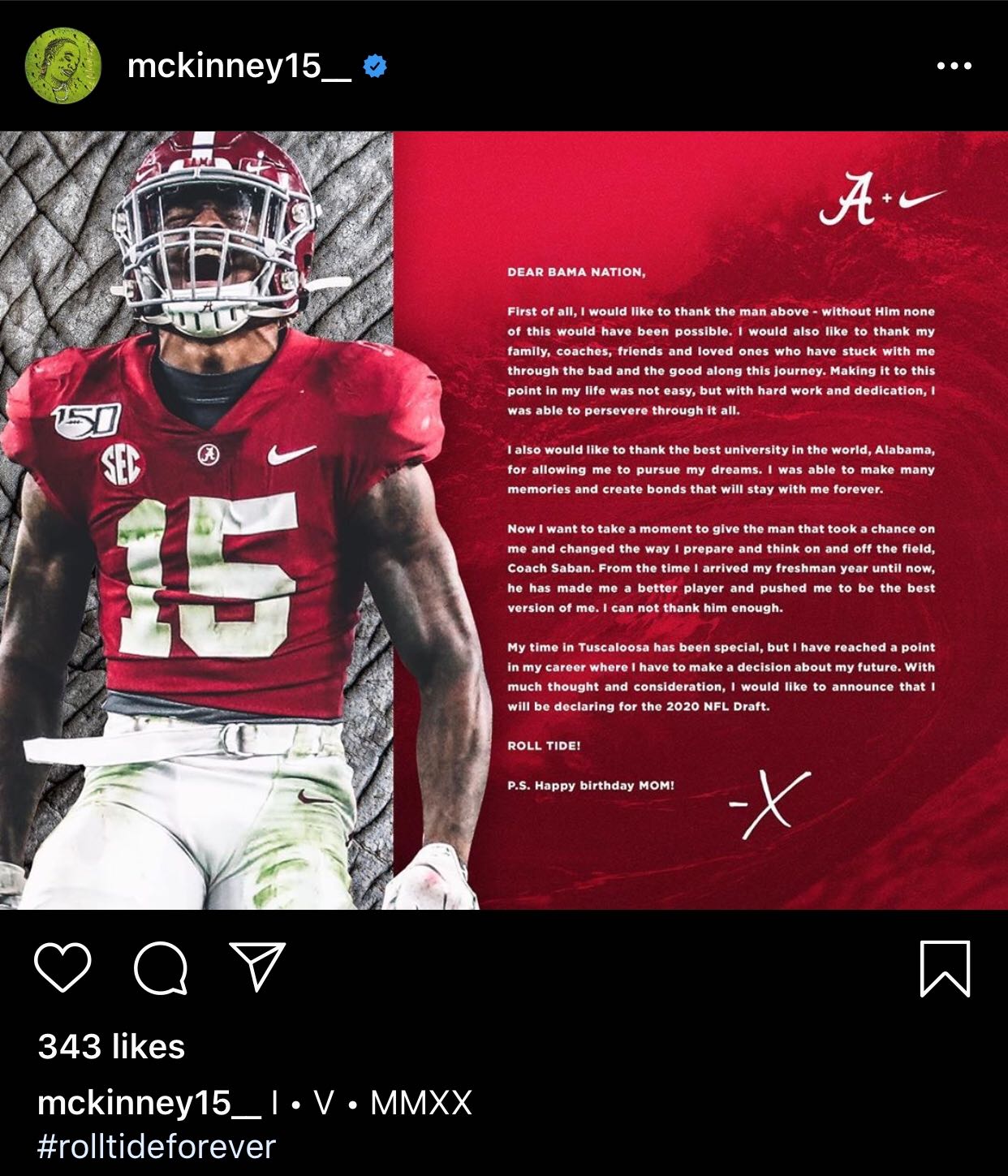 According to Matt Zenitz of AL.com, McKinney received a first-round grade from the NFL’s Draft Advisory Board. If that information is accurate, it makes sense that McKinney would capitalize on his current value leading up to the 2020 NFL Draft.